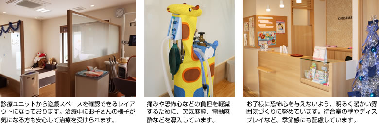 当院はまず、そういう「イメージ」にもこだわります。リラックスしてお子様に治療をうけて頂くために医院の雰囲気・環境なども配慮しております。お子様が遊べるスペースも確保してます。